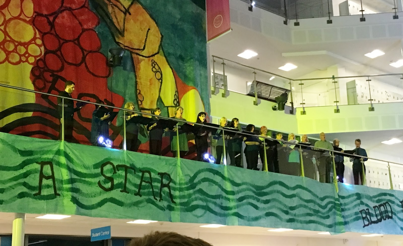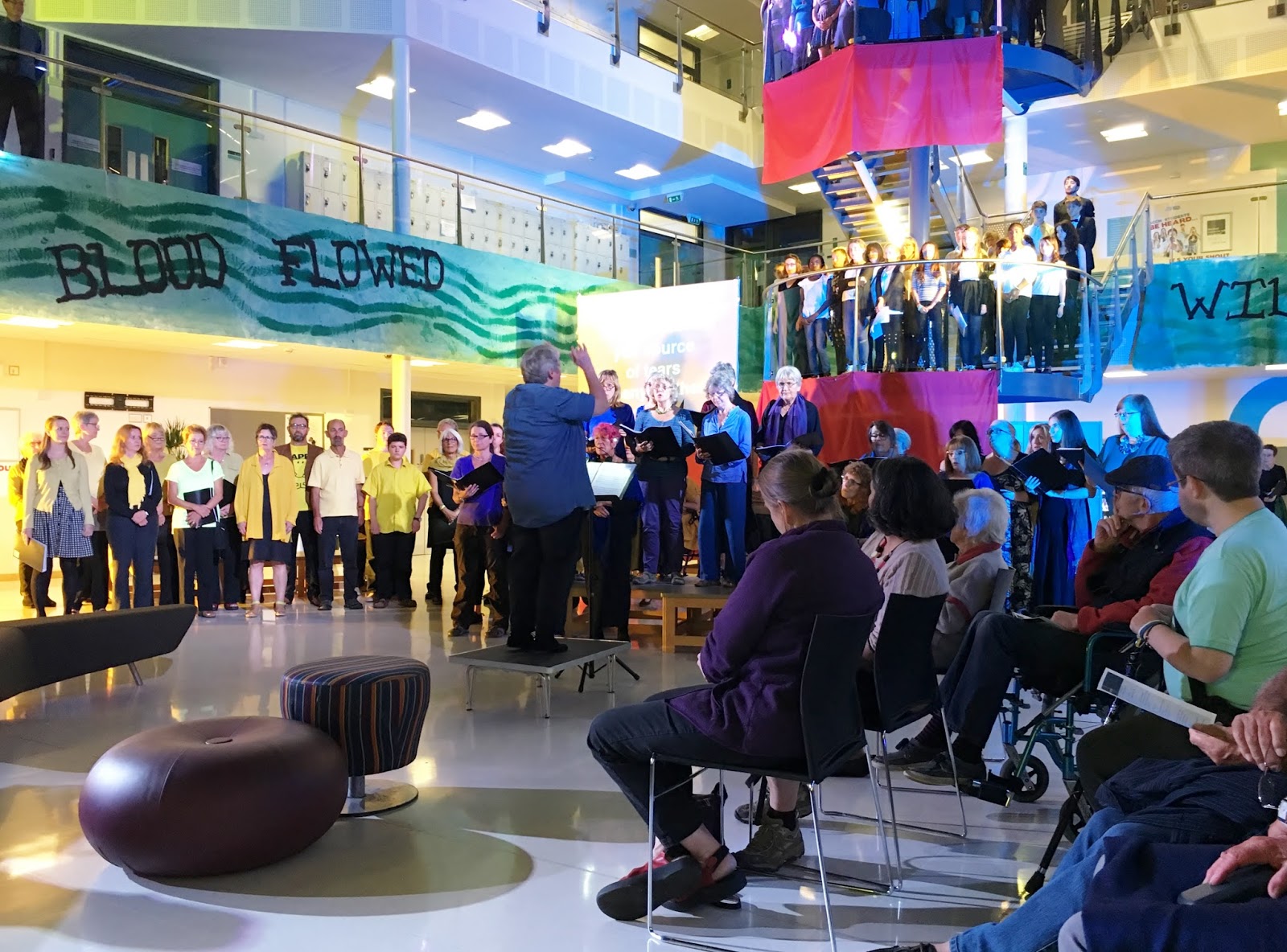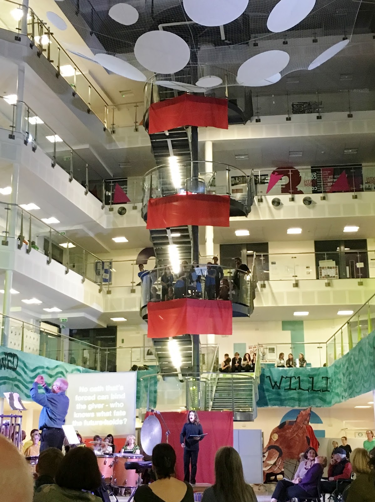 The venue, the atrium of the Sussex Coast College in Station Plaza, was spectacularly suitable, with tiers of balconies and staircases providing perching points for the choirs. The audience had been asked to perambulate round the downstairs area, but by and large, those that found seats stuck their bums in them and didn’t move, and the rest sat on the floor or stood at the back. I think this was probably better. Lots of people wandering around would have been distracting. Also, they only projected the words onto one smallish screen at ground-floor level, and people walking about would have hidden it. Note to organisers – if you do it again, hang the screen from a balcony higher up, like opera sur-titles.