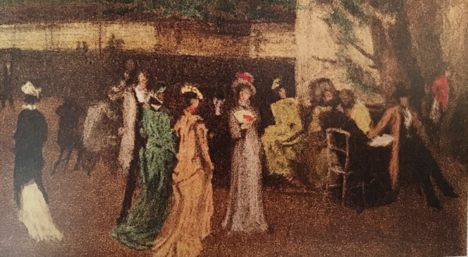 Blimey, I’ve commented before how intrepid those Victorians were. The climb up from Harold Road is very steep, even on Mr Rogers’ improved path – and the women were in long skirts and tight corsets. The reference to ‘Cremonie’ above refers to the Cremorne Pleasure Gardens in Chelsea, London. By the time these gardens closed in 1880 they were notorious for rowdiness, drunken behaviour and prostitution. Here’s a painting of the nightlife in the Cremorne Gardens, c 1870, by Rex Whistler: