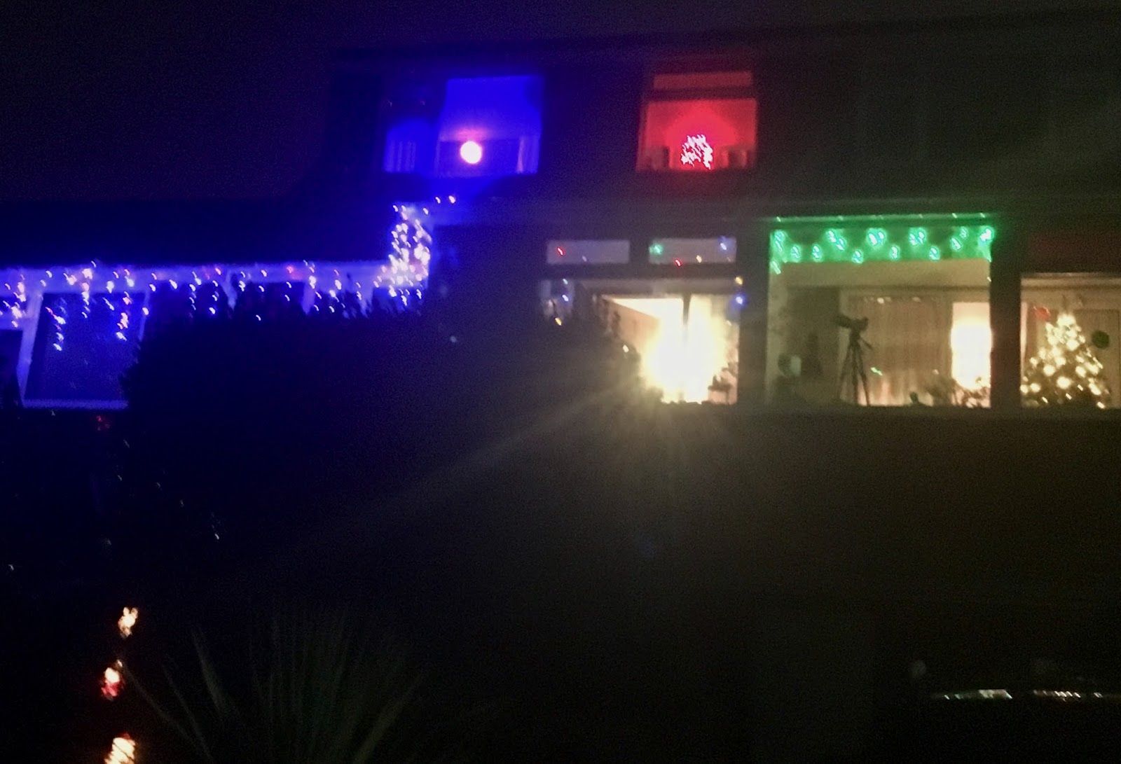 We do love Christmas lights….. Our little close is gradually getting in on the act, but our house is still a beacon of sparkly vulgarity in he midst of discreet gentility….