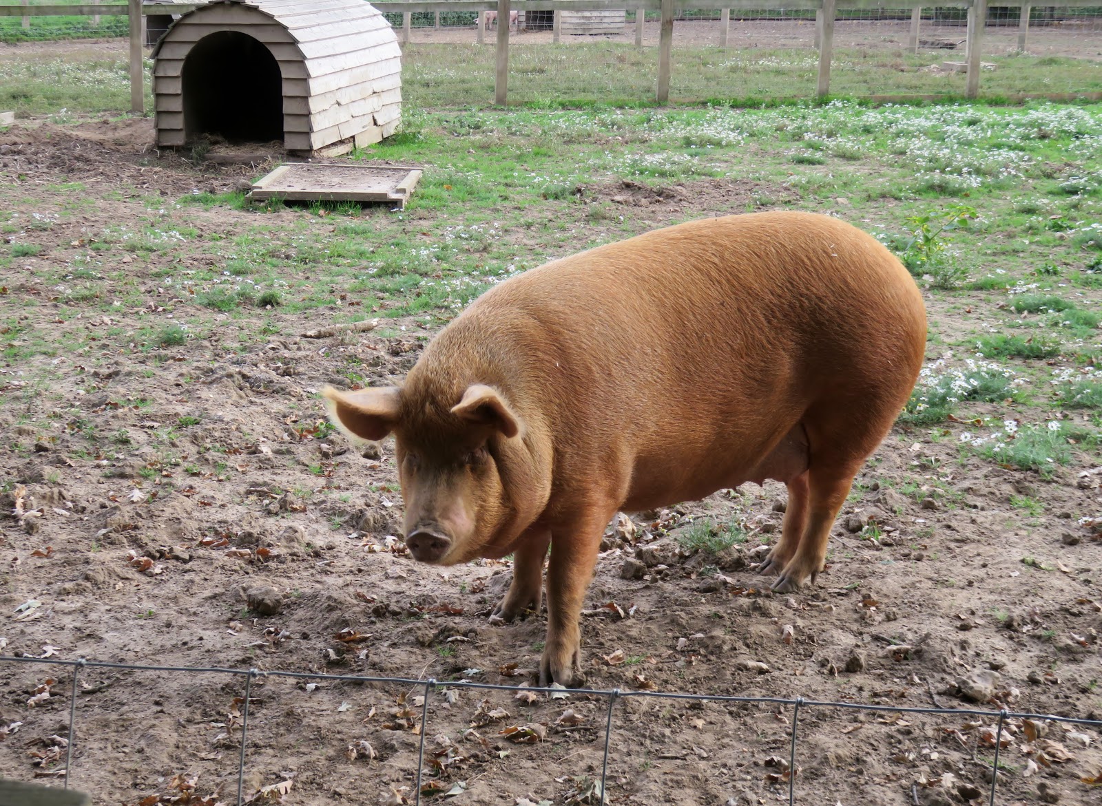 We drove back with a tea stop at Quarr Abbey, between Ryde and Fishbourne. It is a Benedictine monastery that supplements its income with various tourism activities. It is a peaceful place, with a well-stocked farm/produce shop and a pleasant tea-garden staffed by thoroughly unmonastic-looking young women – I had expected to see brothers in brown habits with cords round their waists. Apparently, genuine brothers are in short supply… We had a look at the Church – very plain and suitably austere, and encountered the Abbot was in an art gallery, laughing with the exhibitors in a very frivolous manner. I asked him the whereabouts of the pigs – I am very fond of pigs, and had read that the Quarr Abbey pigs are exceptionally beautiful. He directed us to htem, but neglected to say that you could buy food for them at the shop. They were indeed lovely pigs, and rushed over to us very enthusiatically, only to retire disgruntled (hah) because we had nothing to give them.