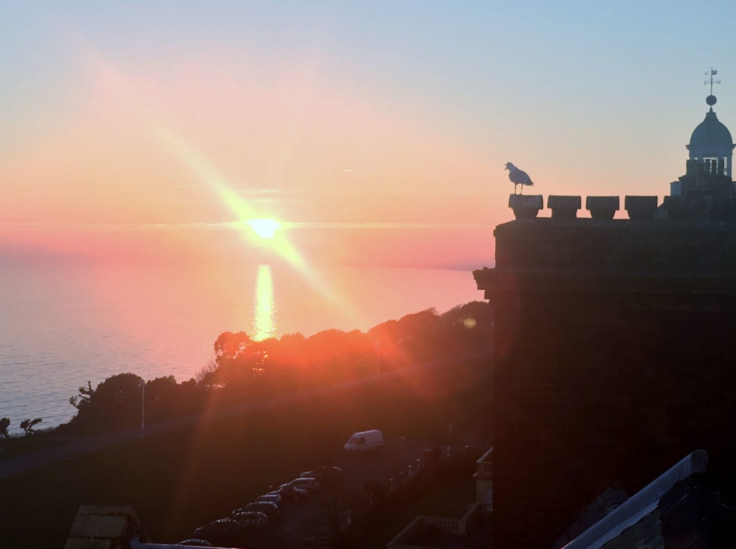We had a sitting room with oval windows on one side that looked straight out across the Channel, and on the other side we looked westwards towards Hythe and Dungeness. We had a big bedroom that opened out onto a little balcony area right in the middle of the big old chimneys, a kitchen, and two bathrooms for some reason. It was all very comfortable – no complaints whatsoever, and the sunset views were incredible. It was also very reasonably priced!