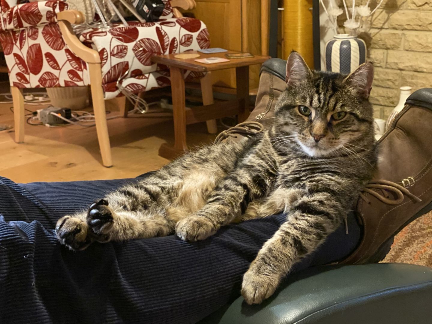 The political situation is indeed Hell. We are now aqua-planing towards an election on 12 December, with, I fear, a pretty clear certainty that the Tories will win, railroad through some crazy Brexit, and then grind our faces into the dust for the next five years. The centre/left/Remainers can’t get themselves together to agree on a blocking strategy… Friends tell me to stop worrying about politics and to think about fluffy kittens instead. So here is Digby the cat, reclining on Philosopher’s legs, also taken with the new phone. The camera is totally excellent.
