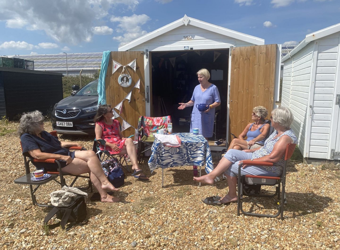 I’ve been swimming in the sea today with Philosopher, and yesterday, with the WI Book Club. Just right discussing what we have just read while floating about in the waves. Given that the sea temperature in Hastings doesn’t reach its highest until end August, early September, it was remarkably warm. We went to friends Jan’s beach hut. Here are a couple of pics. Yes, OK I look a bit fat but am just back from hols and have also gained half a stone over the pandemic which has not budged.