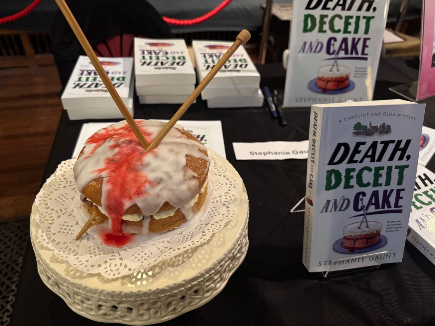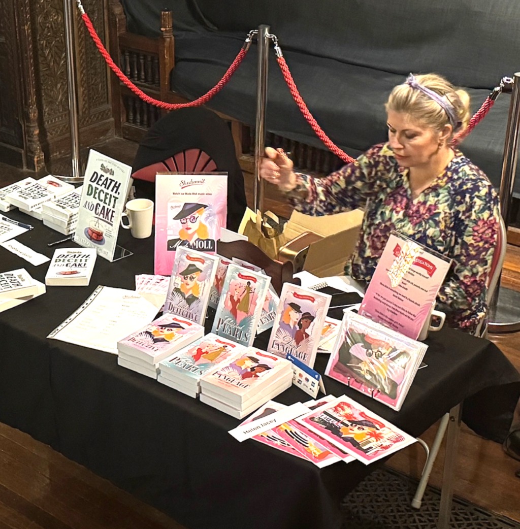 I enjoyed the company of my table-mate, St Leonards based writer Helen Jacey. Helen writes 1940s themed crime mysteries. Her sleuth, Elvira Slate, has a dodgy and interesting past. I first ‘met’ Helen at the East Sussex WI Zoom Crime book club during lock-down. It was partly that group which decided me to get down to writing ‘Death, Deceit and Cake’.