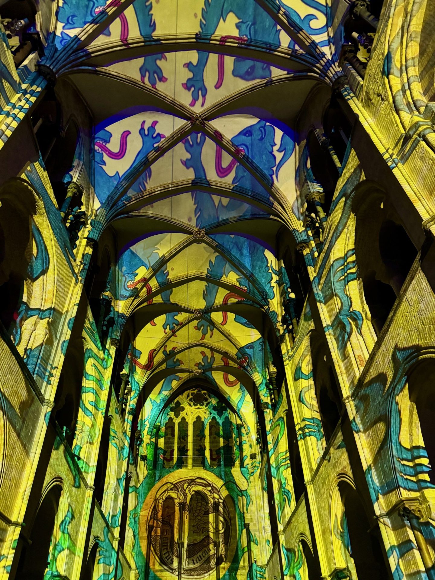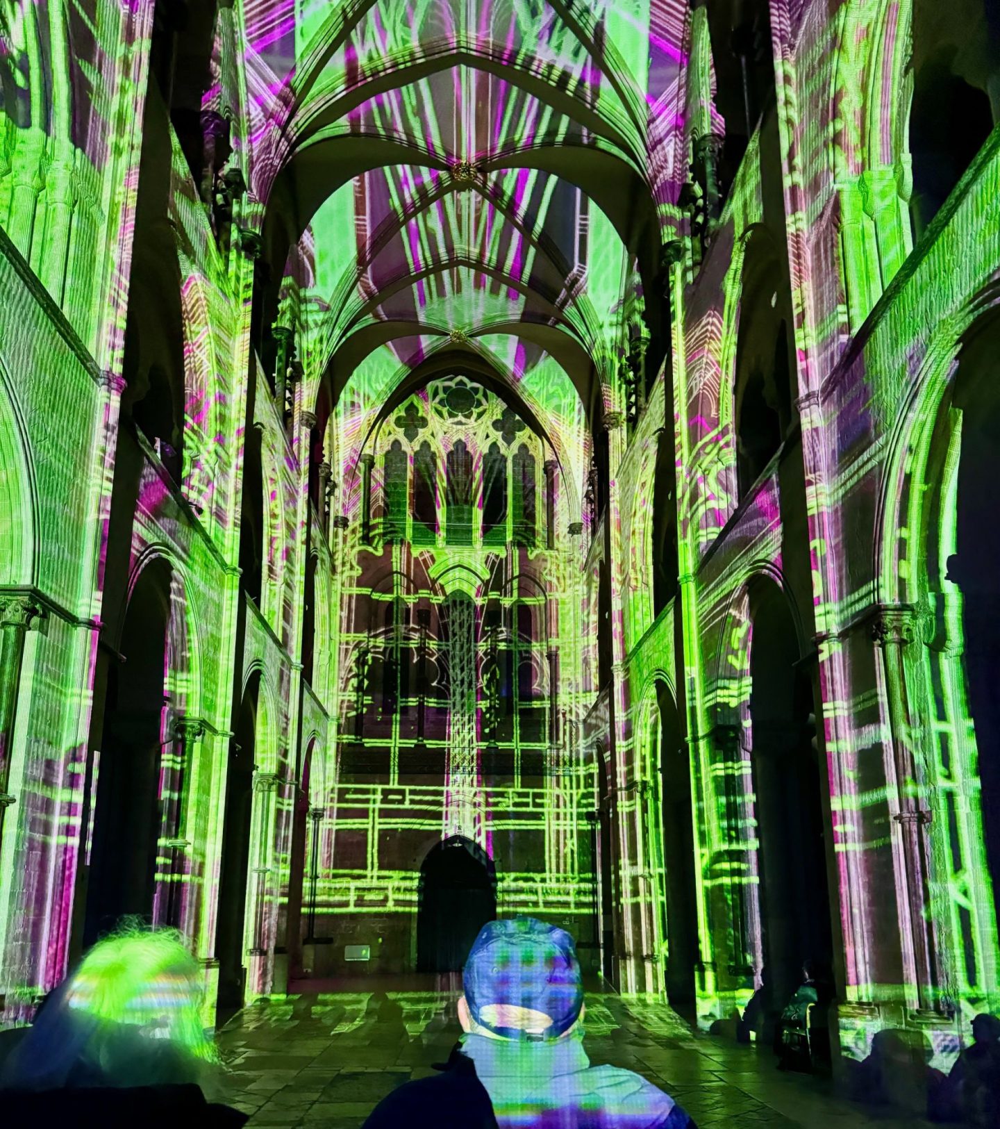 Mind you, although we enjoyed it – and as far as we could tell, as did our fellow visitors – it would have been hopeless for anyone with epileptic tendencies, or autistic folk like like my grand daughter – it was incredibly light-flashy, noisy, woozy-trippy and generally overwhelming. Our ‘walk through’ only lasted about 30 minutes, which was probably enough… It cost £13.00 each, and we estimated they let in at least 100 people every 15 minutes. It was packed, with people queuing all round the cloisters. We estimate the Cathedral must have made a great deal of money out of it – enough to buy new tellies at 4 Canon Lane, maybe?