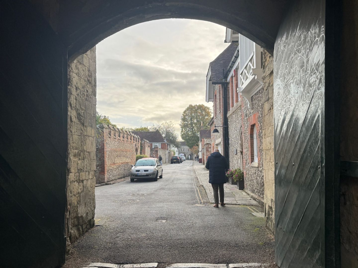 Next day, we had our usual early walk in the Bishop’s Palace Gardens. I put a couple of photos on Facebook, saying that the Bishop’s Palace is the model for the Medford Bishop’s Palace in ‘Death, Deceit and Cake.’ Caroline, Bee and Faisal stay there with the Bishop, David Forsyth. The archway leading from the Palace, and Canon Lane itself, also feature in the novel.