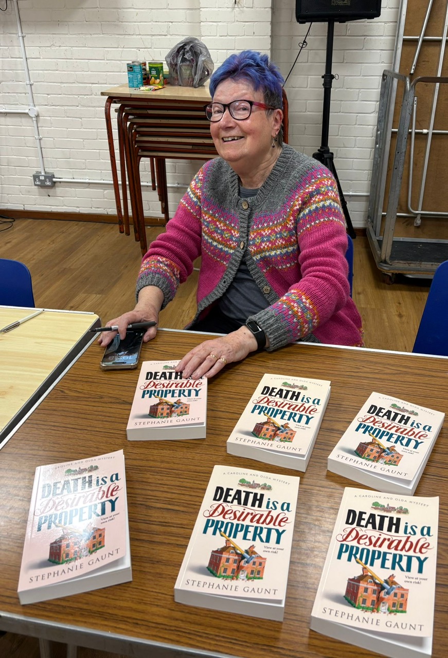 And finally, here’s Battleaxe signing books at the last WI meeting, face carefully turned away to hide bandage – stitches are now out and it’s fine.