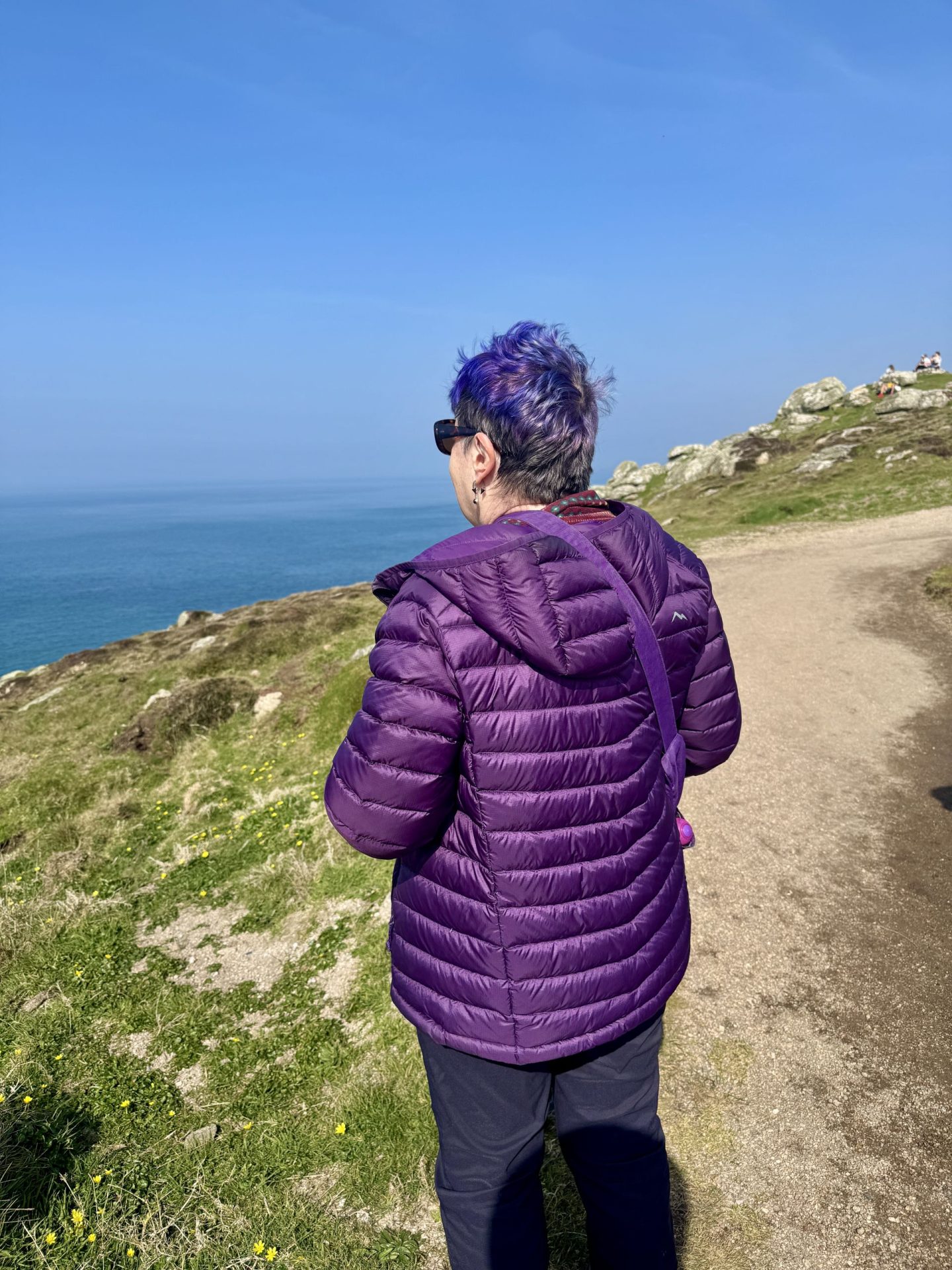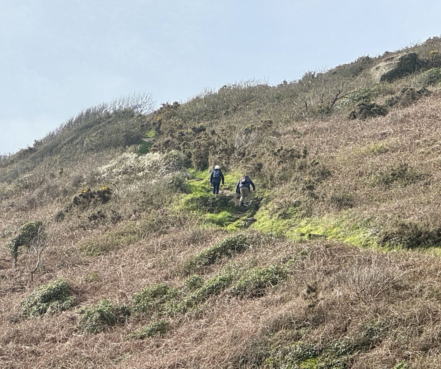 Another day, more familiar things – down to Penberth Cove. However, this year only two of our party – Philosopher and Alex, braved the walk up the steep cliff to get to Logan Rock. Philosopher had always said he wanted to do it when he was so-and-so old. So he did, and lived to tell the tale… Here are the two intrepid walkers disappearing from view up the path.