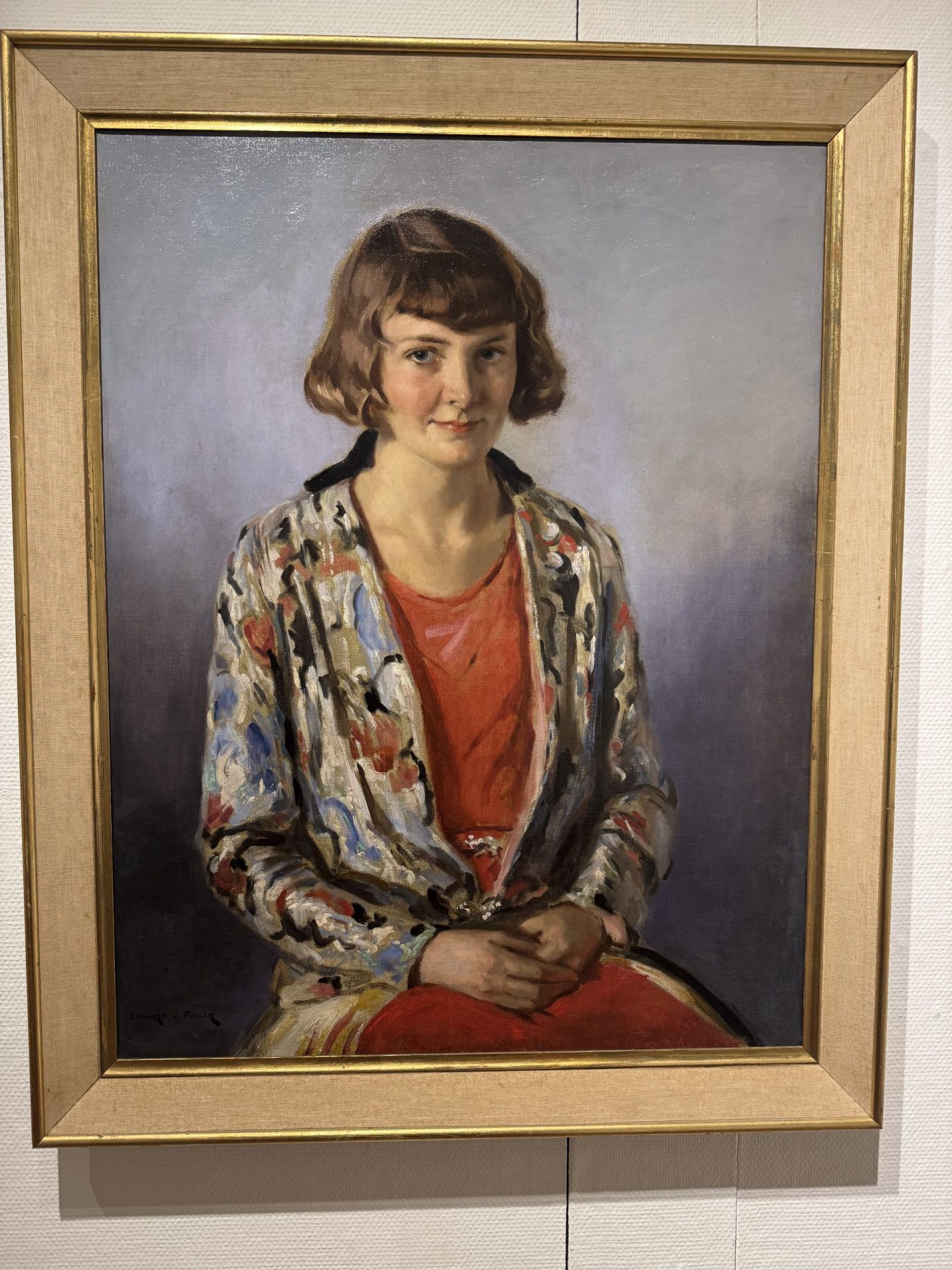 Philosopher and I spent a morning mooching round Penzance and went to the Penlee Gallery, always one of our favourite places, with paintings that are always a joy to revisit. This year they had several by Leonard Fuller on display – readers may remember that we bought one which purported to be by him from a local auction house a few years ago. Here is the blog post about it. The signature on our painting is a bit different from those in the gallery, but on close examination I think it is the same… Here is a pretty painting by Fuller we saw n the gallery, of a young woman – not the same woman as in our painting.